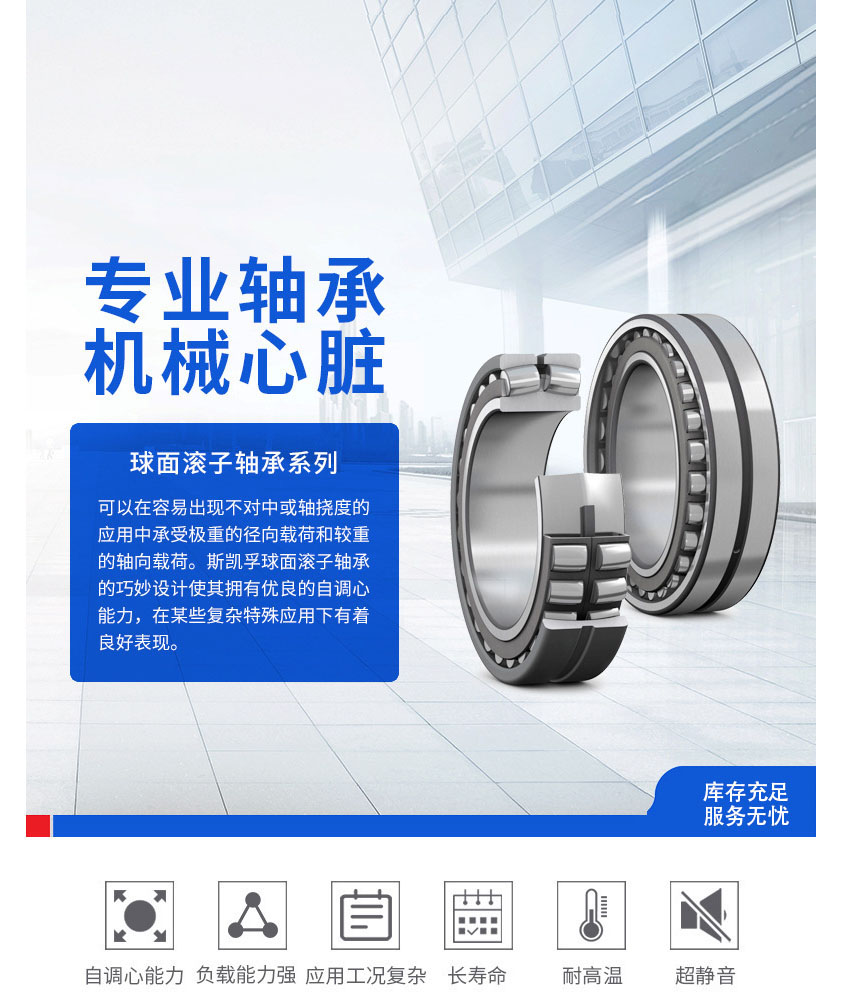 SKF球面滾子軸承的滾子的制造極為嚴格的公差尺寸和形式。每個輥子在集合中的其它輥的尺寸和形狀幾乎是相同的。優化負荷分布輥軸承的使用壽命最大化。